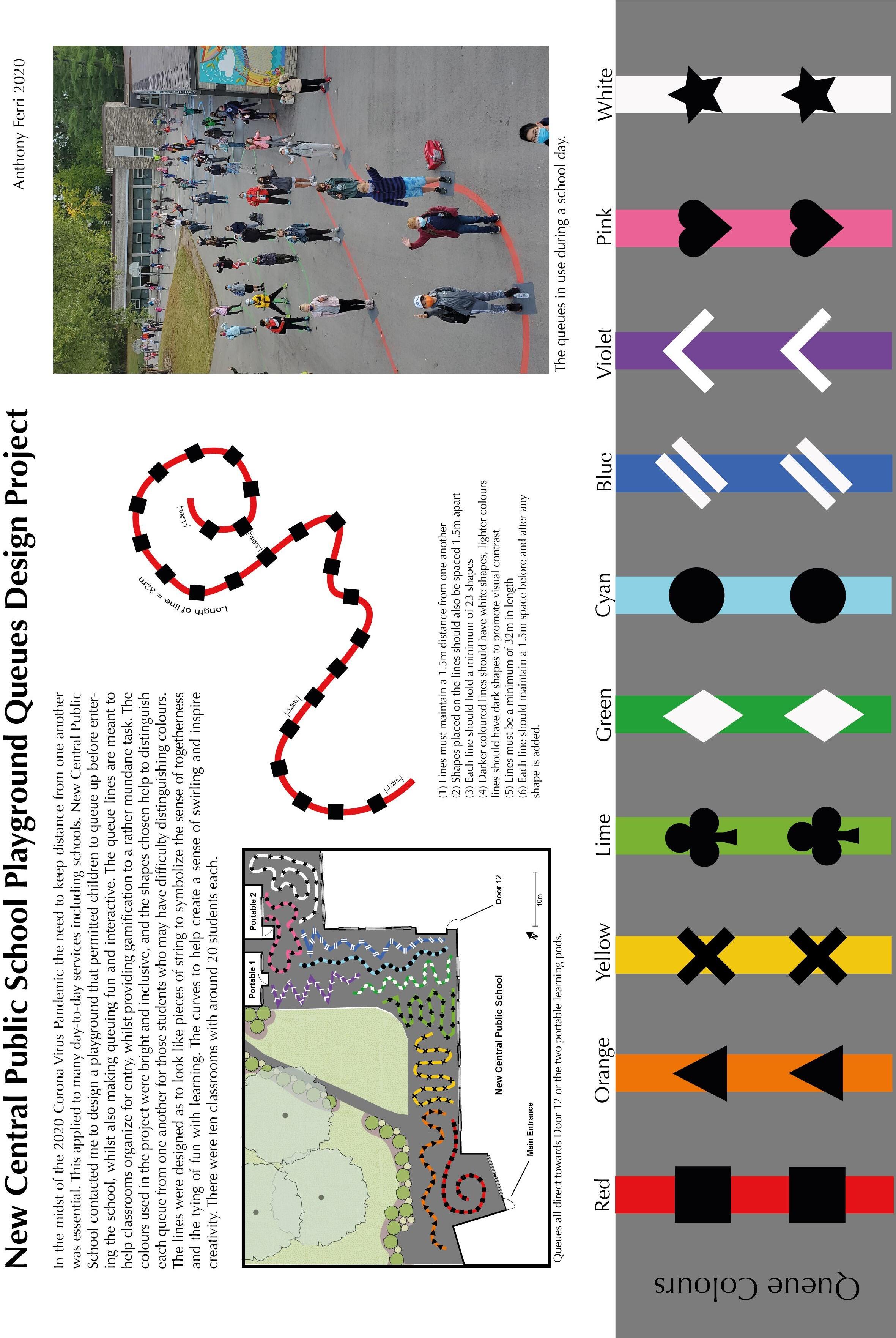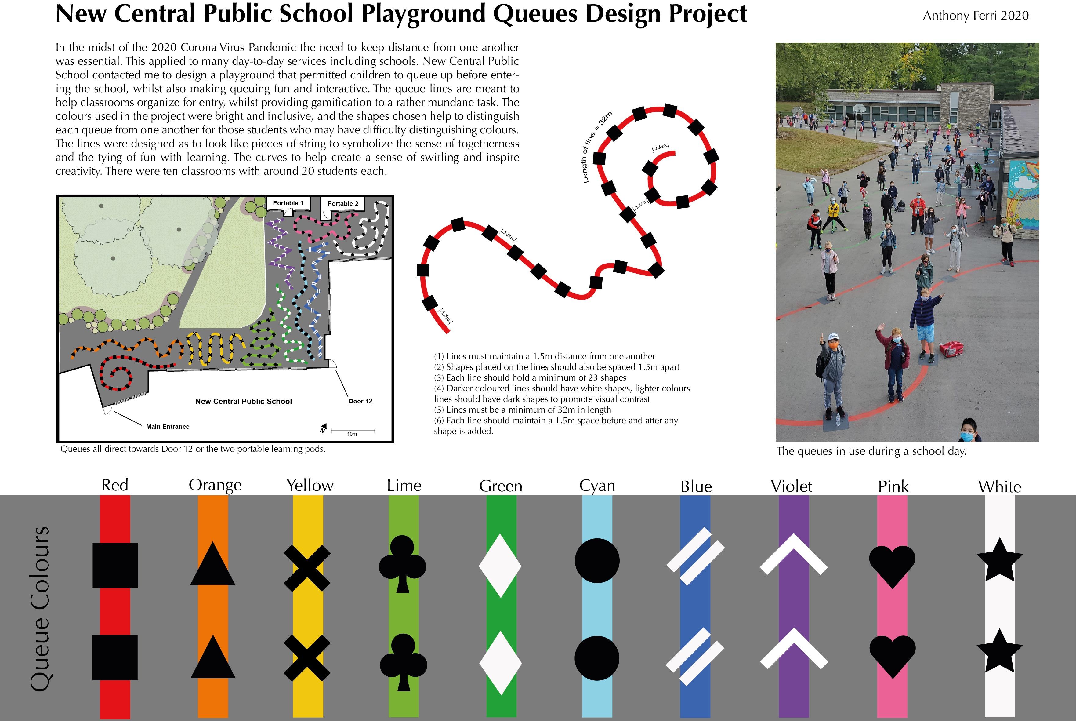 During the 2020 Corona Virus Pandemic the need to keep distance from one another was essential. This applied to many day school time activities. New Central Public School contacted me to design a playground that permitted children to queue up before entering the school