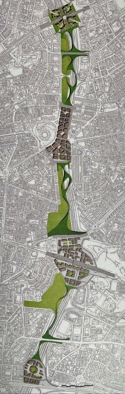 RIGHT: The partial cap of the M30 highway in Madrid was designed when I was a master's student at the University of New South Wales, as part of a design stay at Fundacion Metropoli (Alcobendas, Spain). Each cap encompasses a landmark structure within a precinct and connected by active transport paths. The design takes on an "artificial nature" approach - creating a functional open space system within the existing built environment..