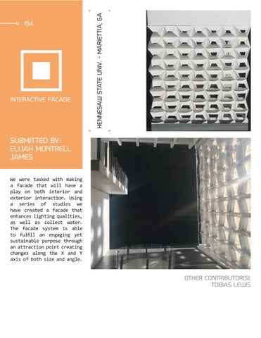 submitted by: elijah montrell james We were tasked with making a facade that will have a play on both interior and exterior interaction. Using a series of studies we have created a facade that enhances lighting qualities, as well as collect water. The facade system is able to fulfill an engaging yet sustainable purpose through an attraction point creating changes along the X and Y axis of both size and angle.