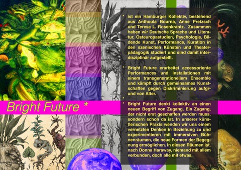 * Bright Future denkt kollektiv an einen neuen Begriff von Zugang. Ein Zugang, der nicht erst geschaffen werden muss, sondern schon da ist. In unserer künstlerischen Praxis wenden wir uns einem vernetzten Denken in Beziehung zu und experimentieren mit immersiven Bühnenräumen, die neue Formen der Begegnung ermöglichen. In diesen Räumen ist, nach Donna Haraway, niemand mit allem verbunden, doch alle mit etwas.