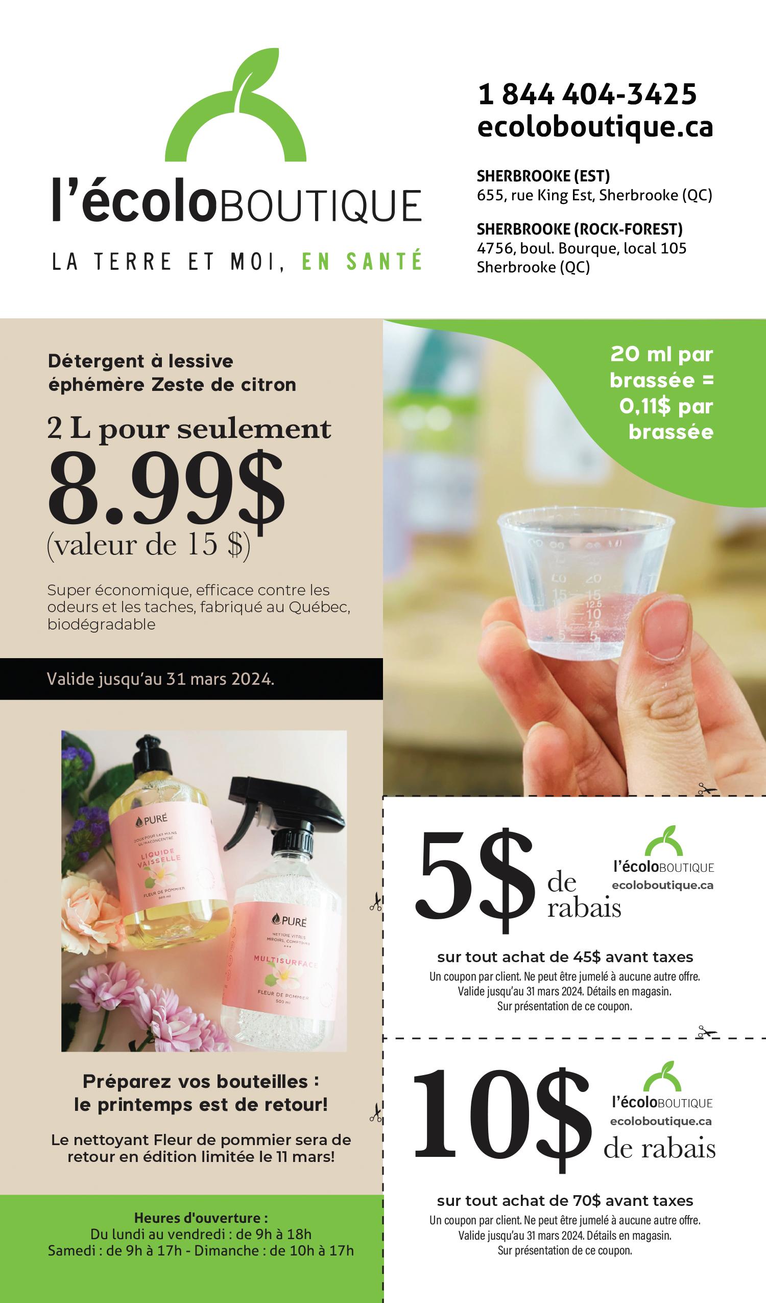 5$ Valide du 1er mars au 31 mars 2024. UN COUPON PAR CLIENT. Non monnayable, non jumelable. Sur présentation du coupon. à l'achat de 100 $ et + sur tout en magasin à prix régulier. Valide du 1er mars au 31 mars 2024. UN COUPON PAR CLIENT. Non monnayable, non jumelable. Sur présentation du coupon.