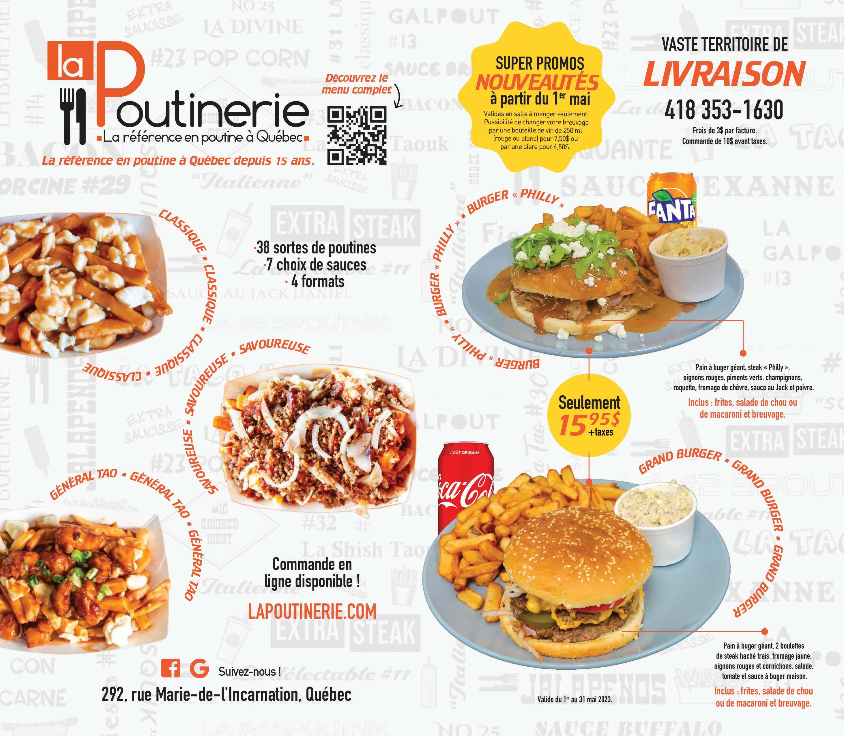 et poutines 1 pers. 3 pers. 6 pers. Frites 3,95$ 8,95$ 11,95$ Mini Rég. Grosse Poutine 8,85$ 12,10$ 17,50$ Poutine italienne 9,75$ 13,50$ 19,95$ Poutine général Tao 9,95$ 14,25$ 20,95$ Poutine poulet & saucisses 10,25$ 14,80$ 21,60$ Poutine garnie gratinée 10,25$ 14,80$ 21,60$ (sauce régulière, pepperoni, poivrons verts, oignons, champignons, bacon et fromage râpé gratiné)
