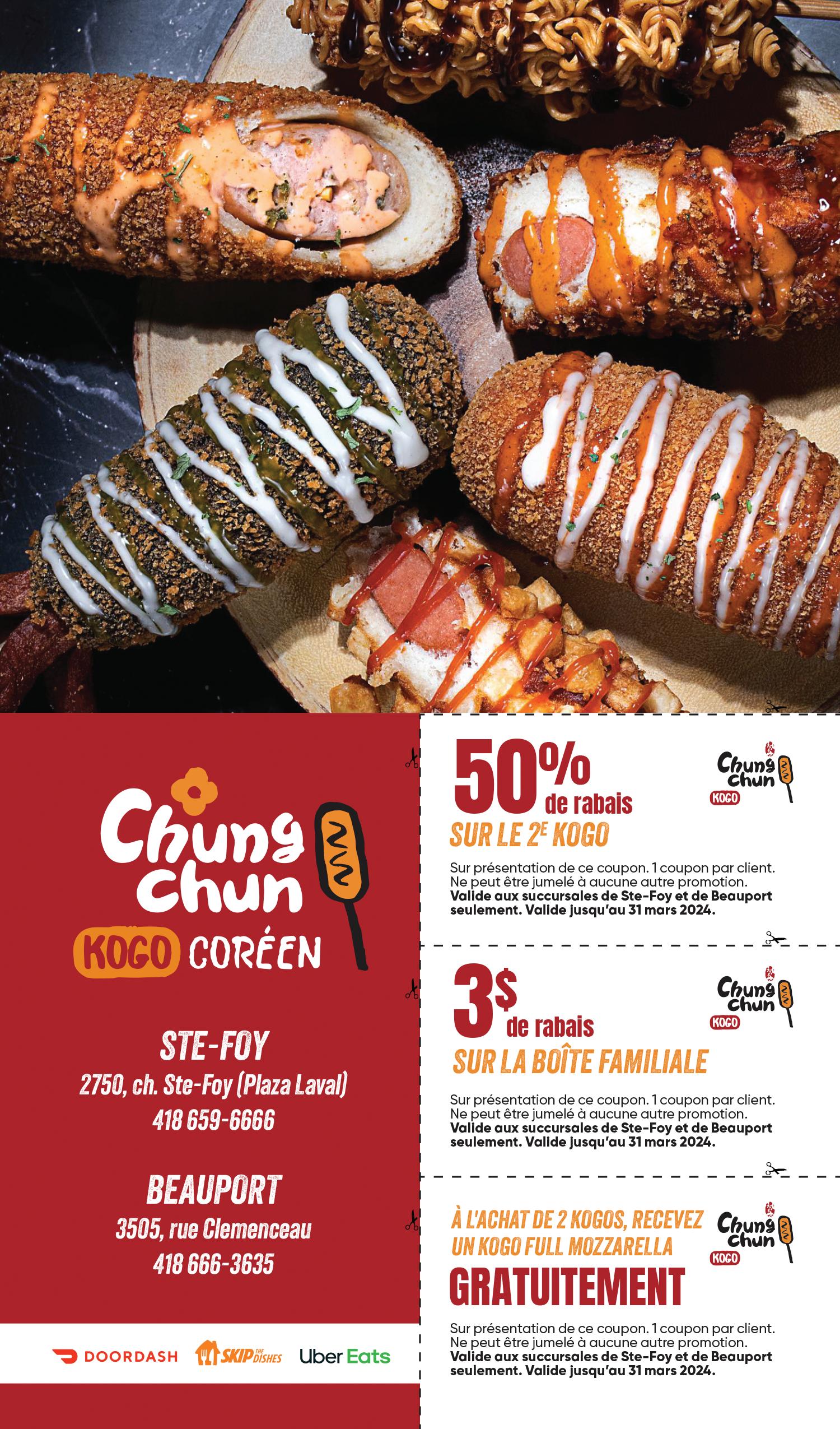 Extras : Fromage en grains .............................................. 3.85 Saucisses BBQ .................................................... 2.85 Poulet 3.29