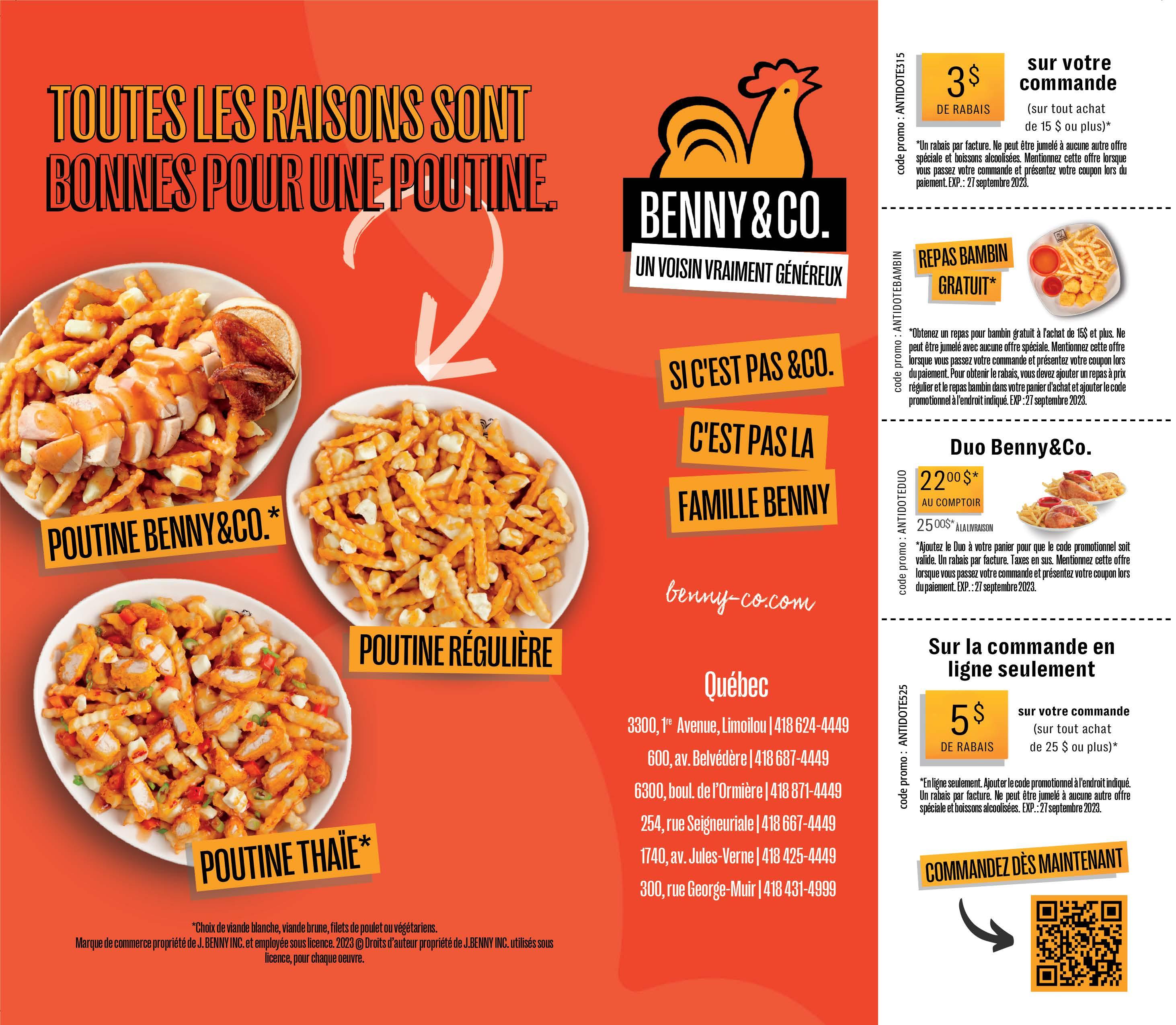 1 pers. 3 pers. 6 pers. Frites 4,35$ 9,50$ 13,50$ Mini Rég. Grosse Poutine 8,85$ 12,10$ 17,50$ Poutine italienne 9,75$ 13,50$ 19,95$ Poutine général Tao 9,95$ 14,25$ 20,95$ Poutine poulet et saucisses .10,25$ .. 14,80$ .. 21,60$ Poutine garnie gratinée 10,25$ .. 14,80$ .. 21,60$ (sauce régulière, pepperoni, poivron vert, oignon, champignons, bacon et fromage râpé gratiné) Poulet