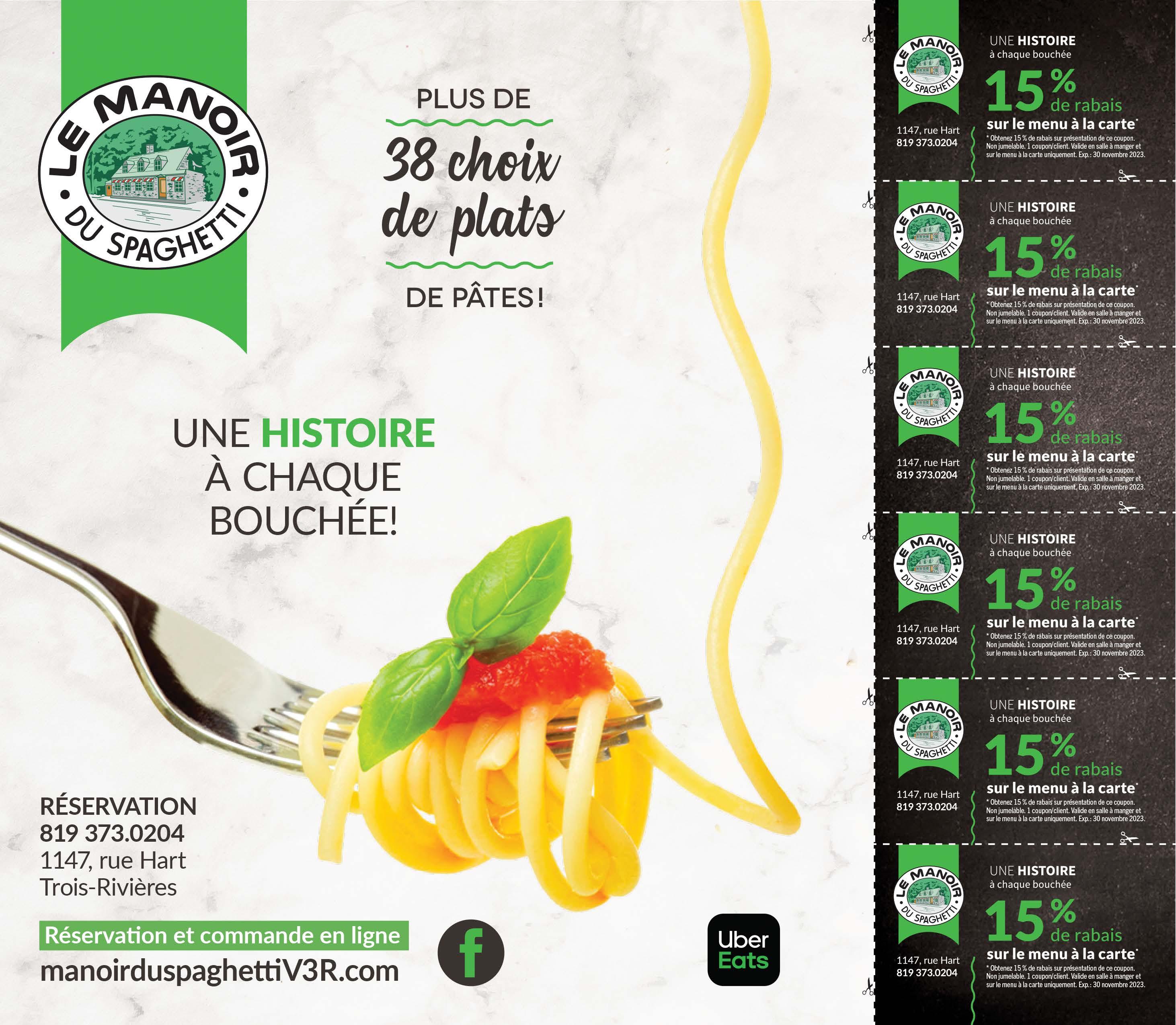 quoifaire.com QUANTITÉS LIMITÉES La Belle Province 10 $ pour 20 $ RABAIS 50% 50% Le Manoir du Spaghetti 15 $ pour 30 $ RABAIS
