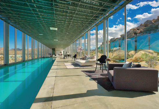 Le design intérieur est tout aussi remarquable, mettant en vedette une piscine intérieure de 100 pieds de longueur qui ajoute une touche de luxe et de singularité. Imaginez-vous en train de nager du salon à la chambre en admirant le paysage désertique. On se délecte de la vue sans être vu puisque les murs extérieurs en verre miroir sont transparents de l’intérieur.