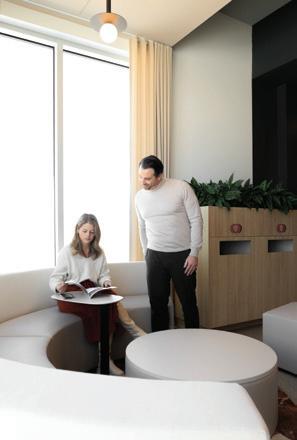 le bain et son mur de miroirs avec des projections à l’entrée. Les aires publiques sont plafonnées d’un ciel étoilé agencé aux corridors bleu nuit qui contrastent à merveille avec les chambres extrêmement lumineuses. Les couleurs vives permettent de dynamiser les espaces tout en offrant un environnement enveloppant.