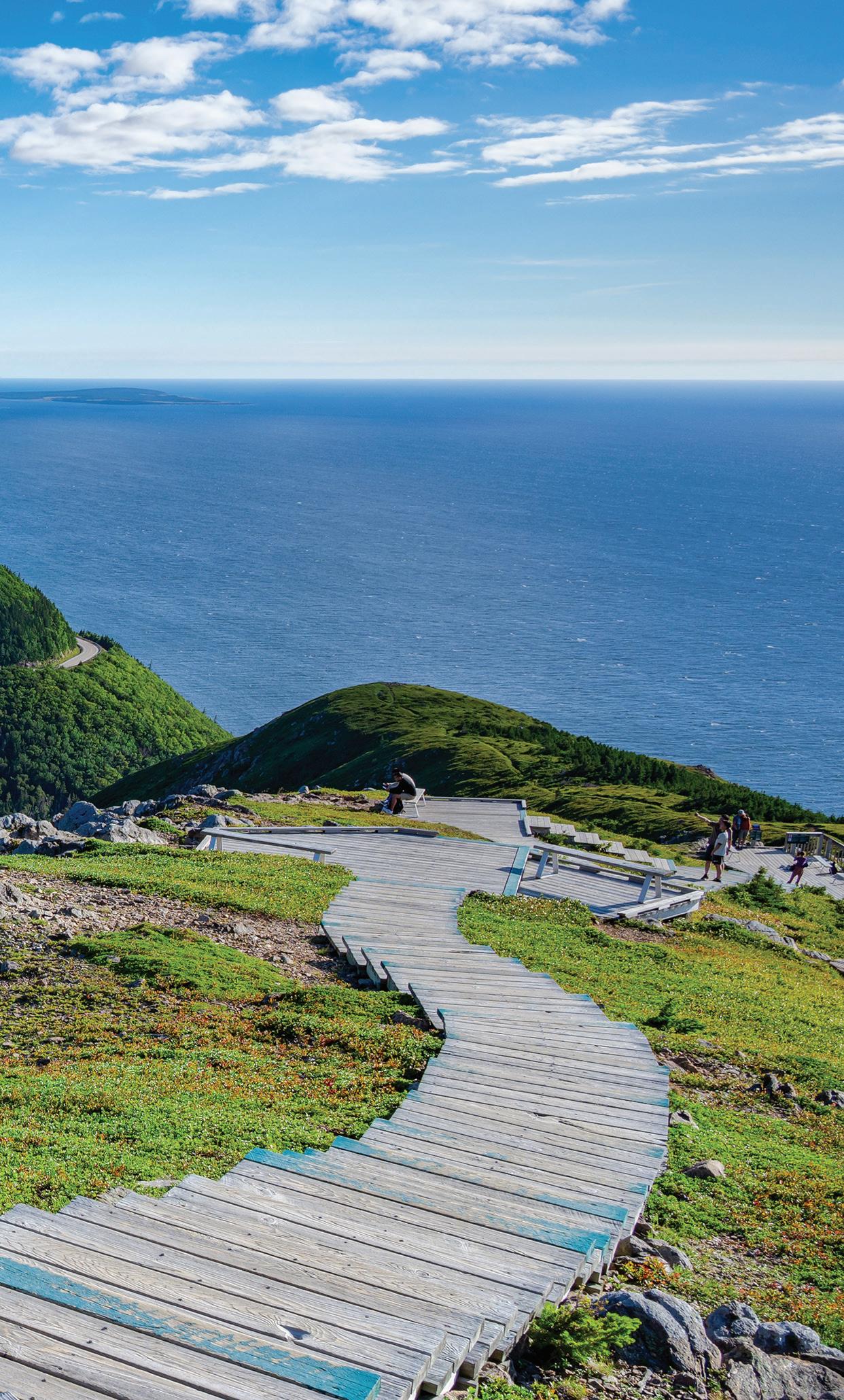 Découvrez la beauté naturelle des hautes terres du CapBreton en empruntant la célèbre Cabot Trail longue de 298 km. Il est généralement suggéré de rouler dans le sens antihoraire comme on accède facilement à la plupart des aires d’observation. N’oubliez surtout pas de surveiller les baleines dans le golfe du Saint-Laurent. Le centre d’interprétation des baleines de Pleasant Bay vous permet justement de découvrir les écosystèmes de la région avant une excursion d’observation des baleines. Ou bien faites l’ascension du cap Smokey à bord du premier téléphérique de l’est du Canada. Finalement, admirez la vue imprenable depuis le camping Hideaway et son marché aux huîtres à South Harbour.