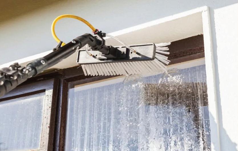 Nettoyage des vitres, cadres et rebords de fenêtres à l’eau purifiée. L'absence de minéraux dans l'eau purifiée lui confère un pouvoir nettoyant supérieur à l'eau du robinet.