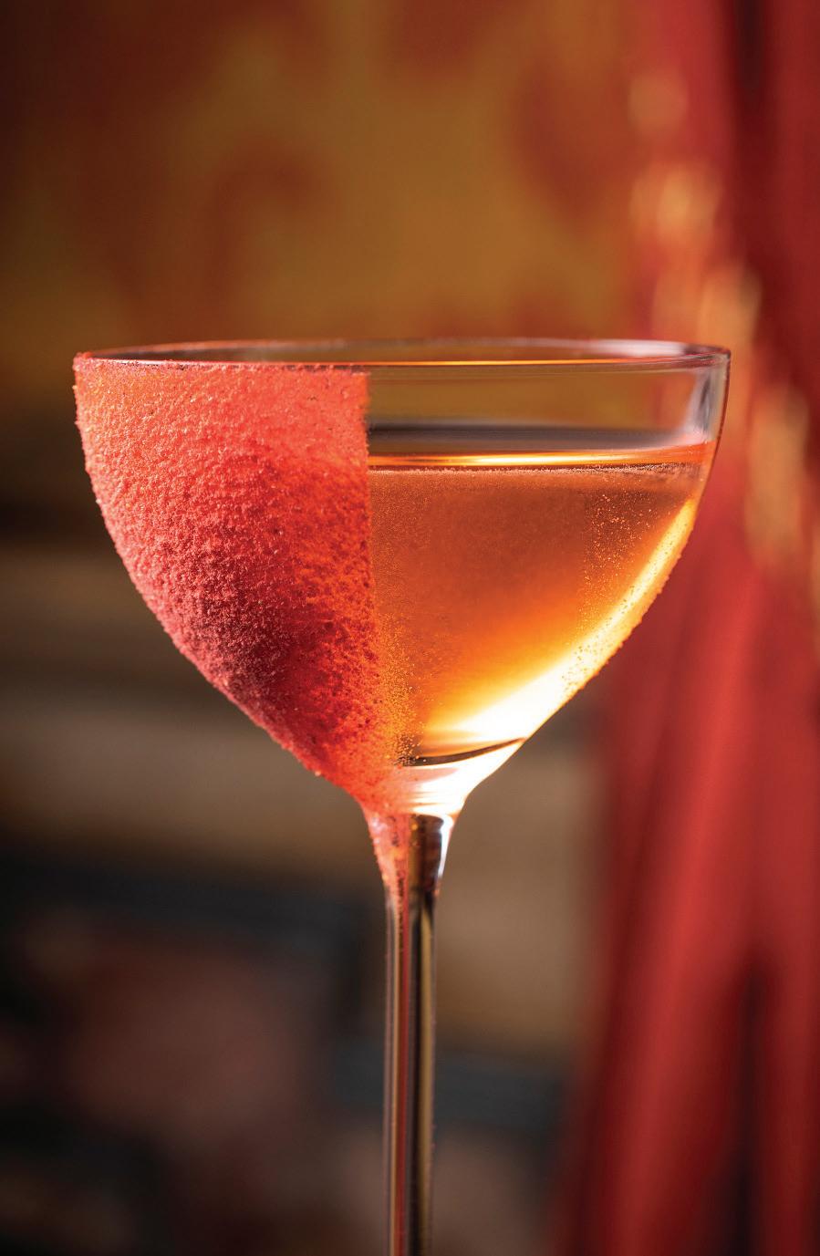 Raffinement et originalité avec cet élégant cocktail signature présenté dans une coupe raffinée, qui se distingue par un spectaculaire givrage rouge sur la moitié du verre.