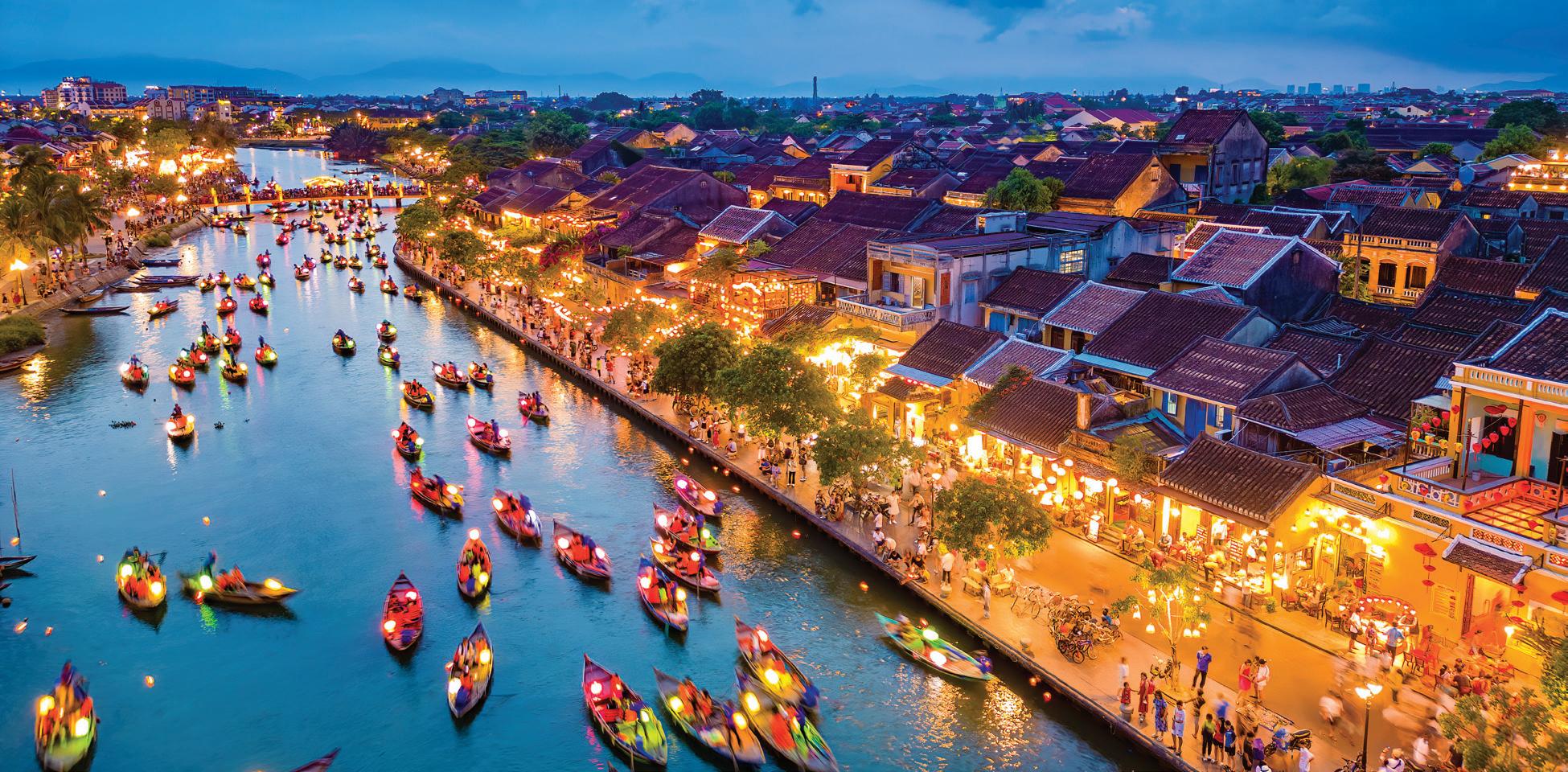 À Hoi An, des barques illuminées glissent sur la rivière, offrant un spectacle féerique au cœur de la vieille ville.