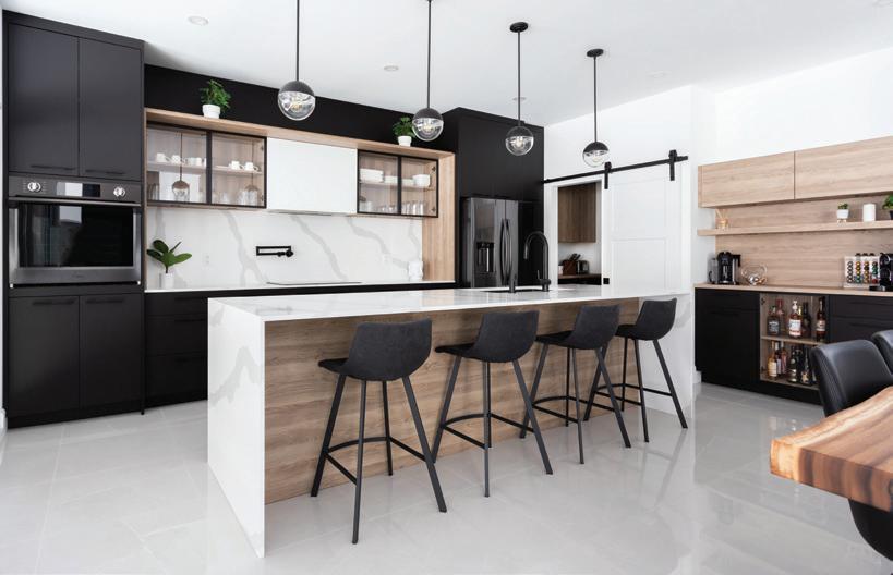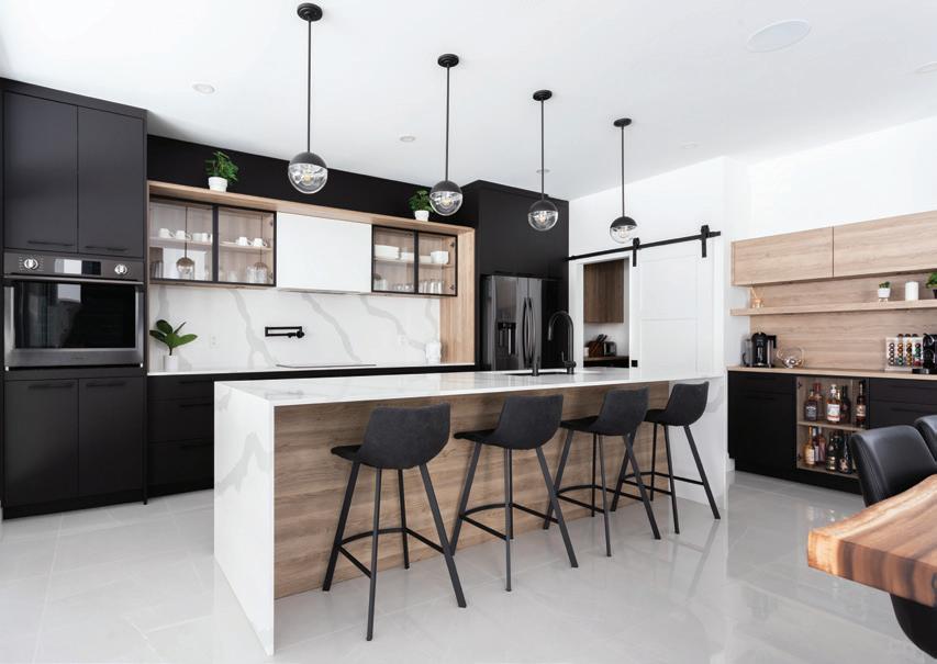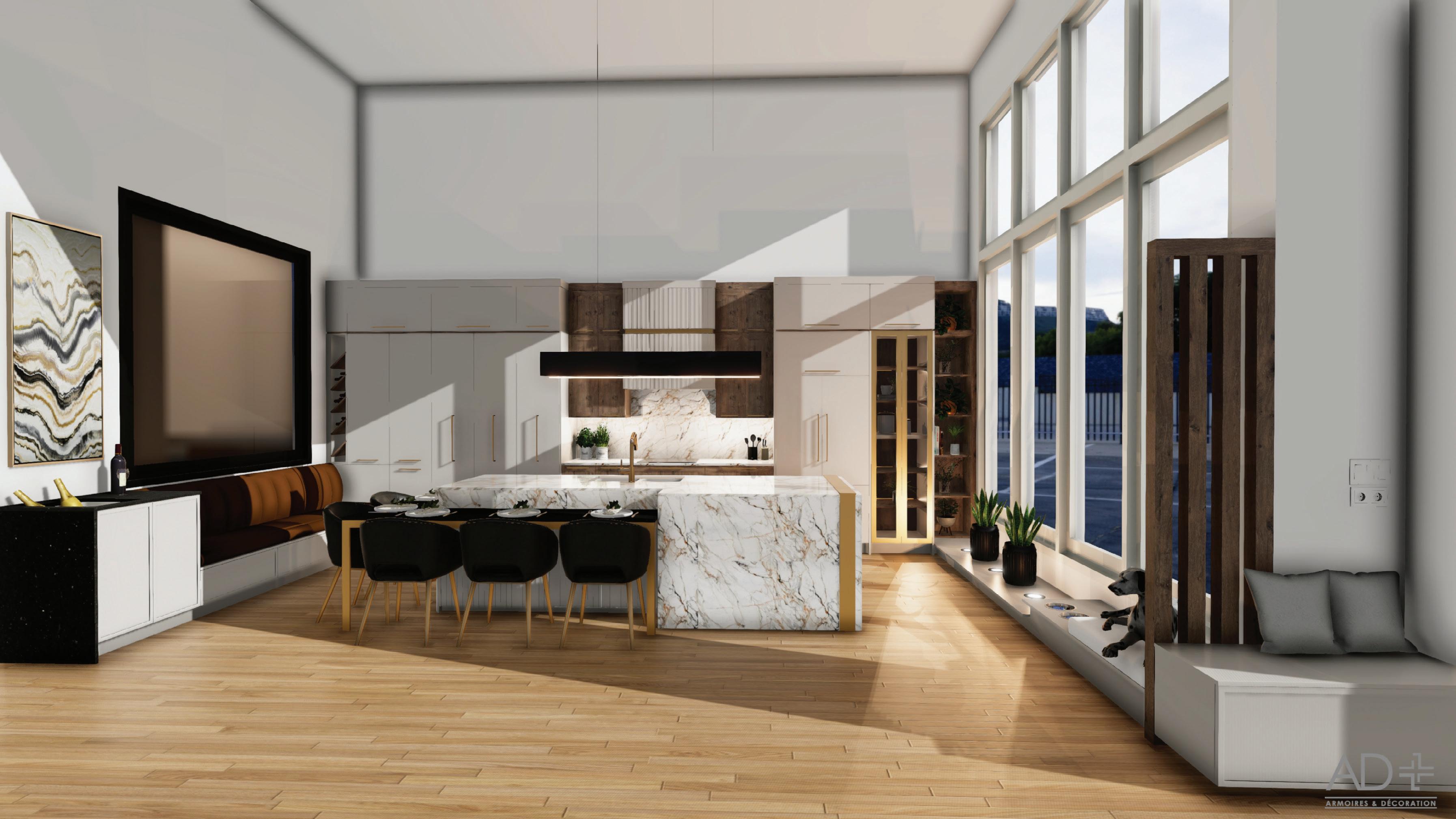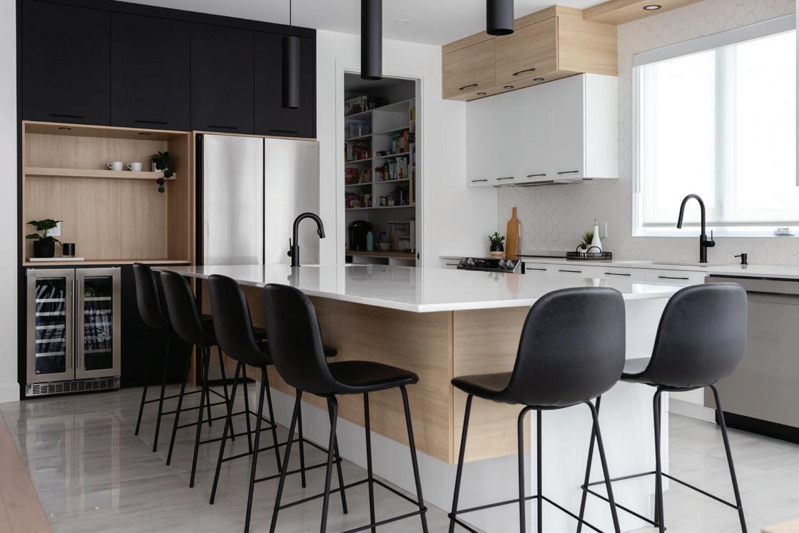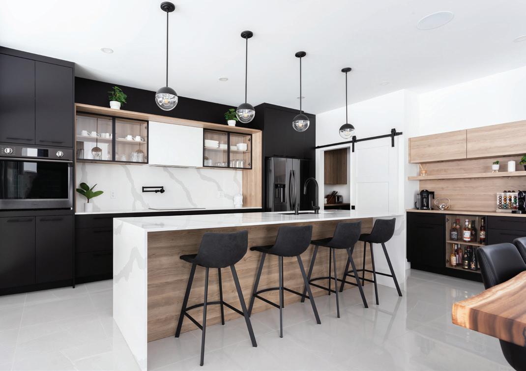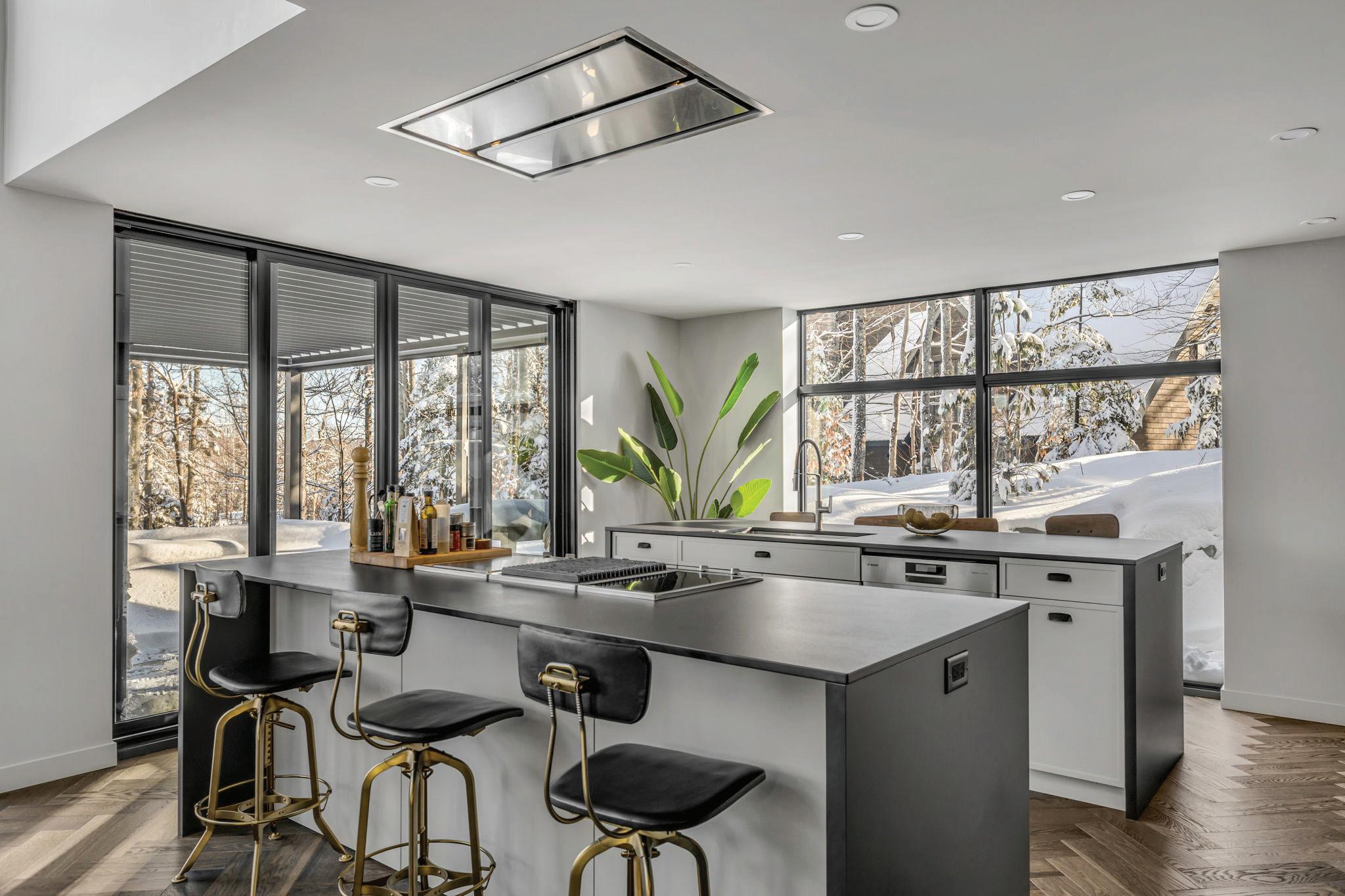 L’élégante cuisine comprend un îlot recouvert de marbre avec des armoires inférieures de conception italienne. La configuration a été pensée en fonction d’éliminer les armoires suspendues qui auraient obstrué la vue panoramique.