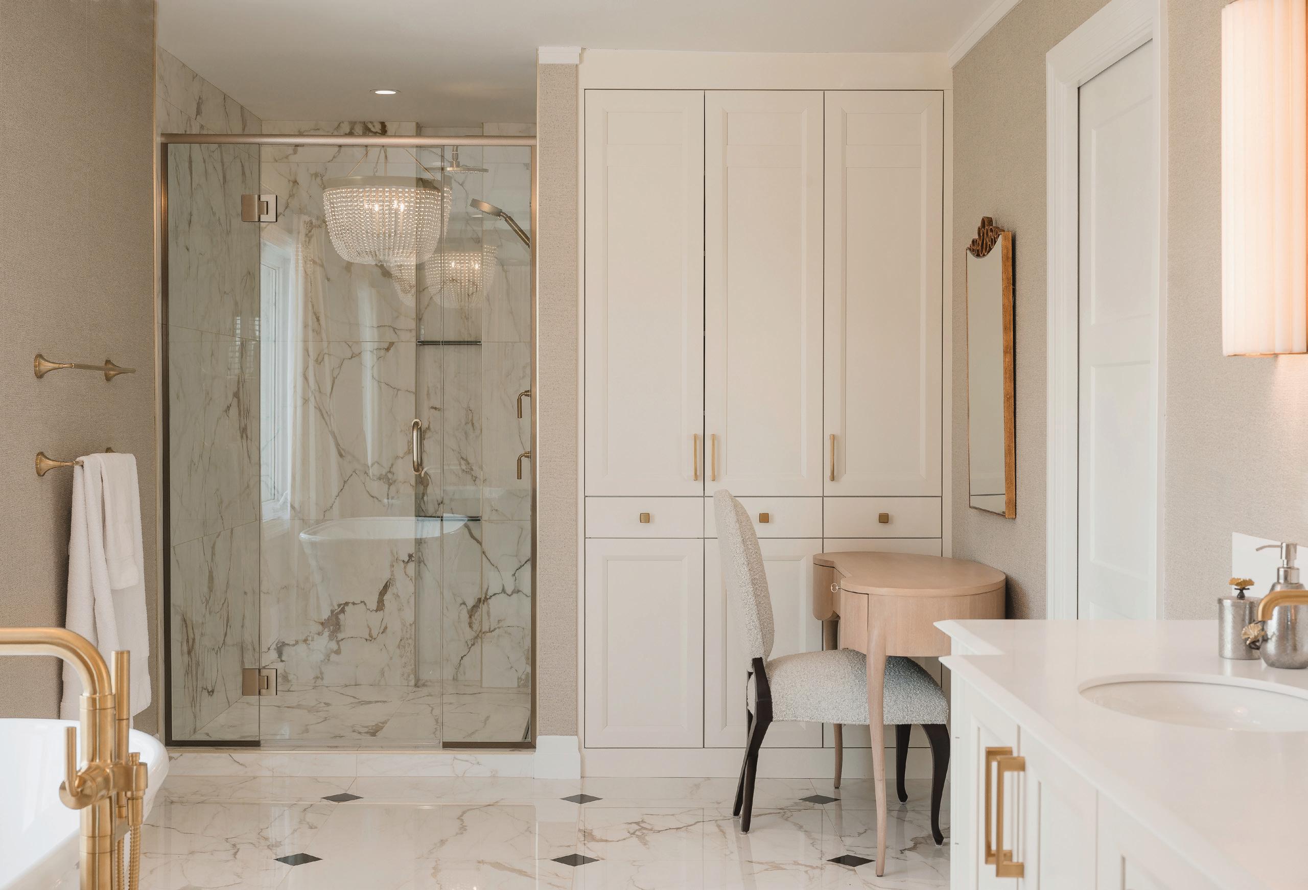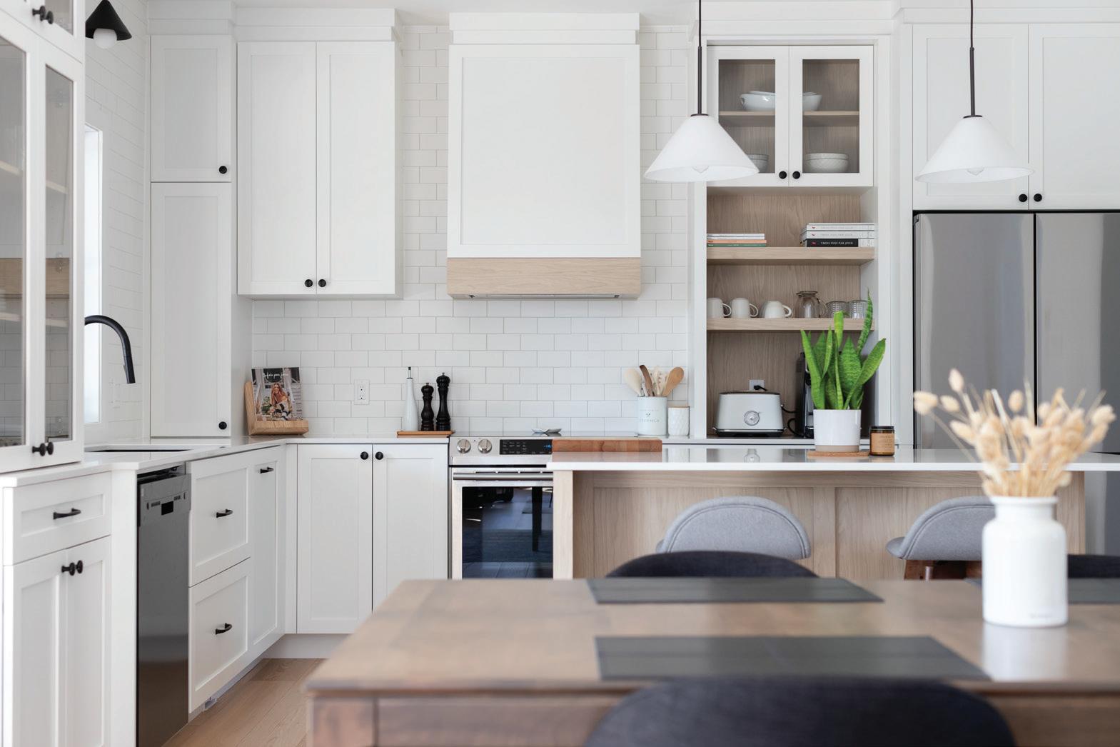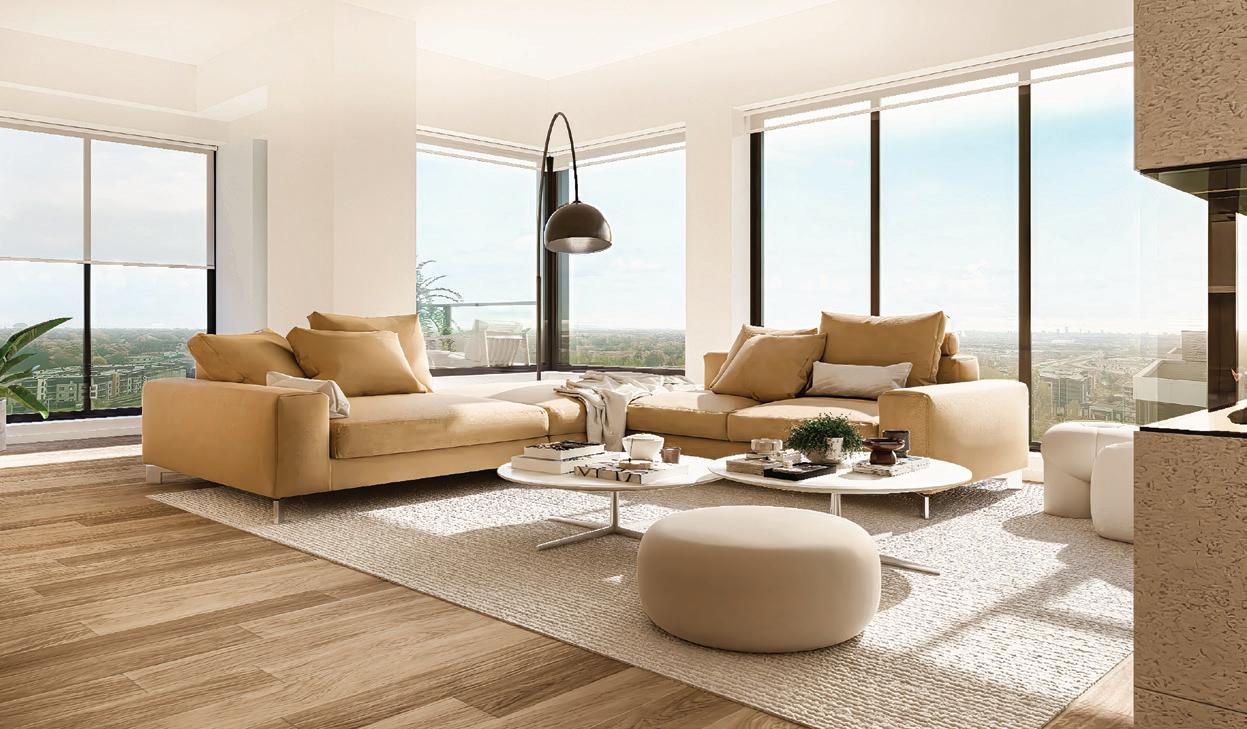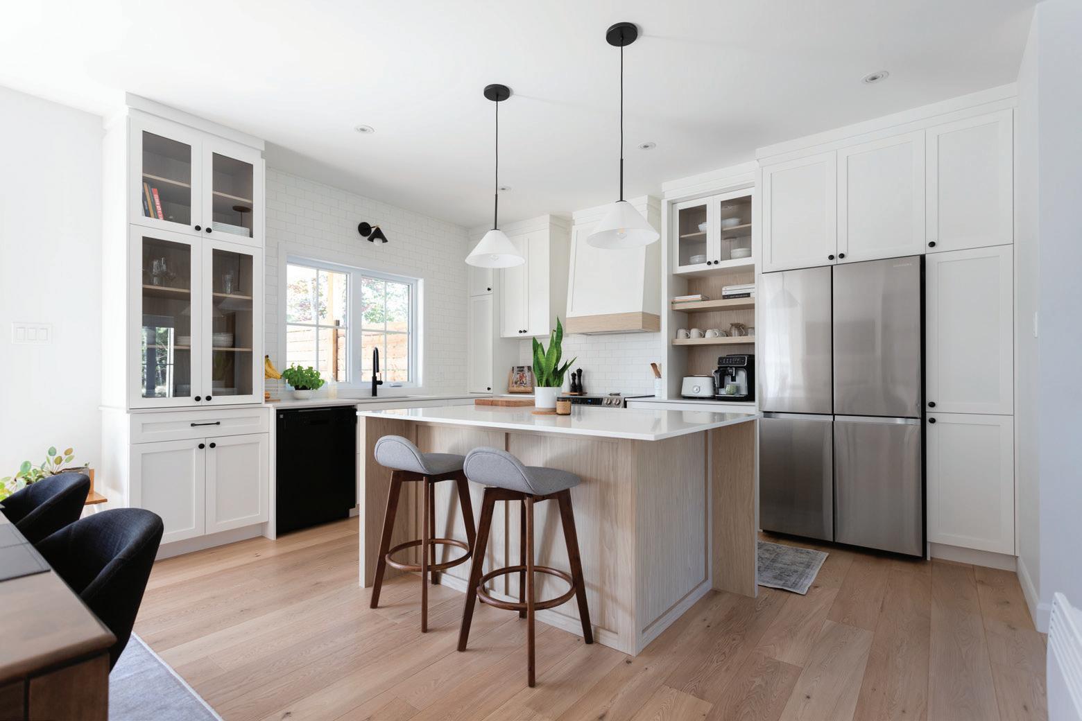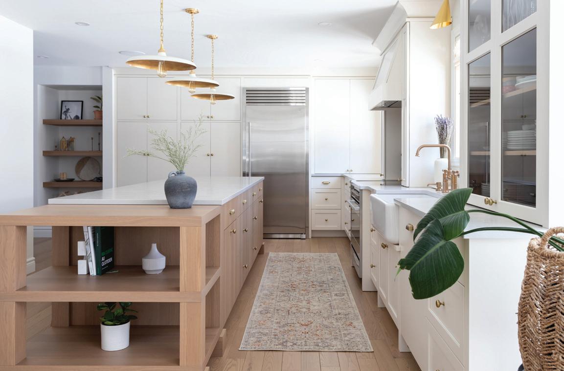 L’élégante cuisine comprend un îlot recouvert de marbre avec des armoires inférieures de conception italienne. La configuration a été pensée en fonction d’éliminer les armoires suspendues qui auraient obstrué la vue panoramique.