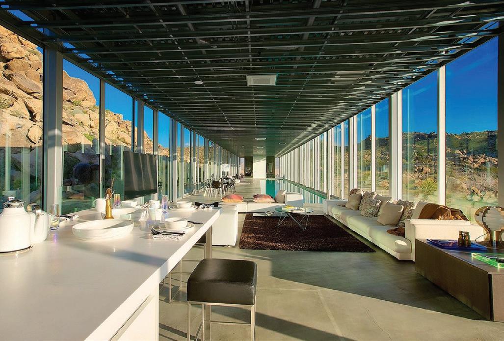 Le design intérieur est tout aussi remarquable, mettant en vedette une piscine intérieure de 100 pieds de longueur qui ajoute une touche de luxe et de singularité. Imaginez-vous en train de nager du salon à la chambre en admirant le paysage désertique. On se délecte de la vue sans être vu puisque les murs extérieurs en verre miroir sont transparents de l’intérieur.