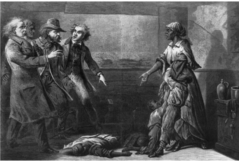 Thomas Satterwhite’s painting of Margaret Garner, a brutal and haunting depiction of infanticide, serves as a powerful visual afterlife of Justinian’s Digest and the legal doctrine partus sequitur ventrem. This historical trajectory, and even nuances within Justinian’s regime are sanitized and reach a terrifying climax in acts like those depicted in Satterwhite’s painting. The painting shows Margaret Garner surrounded by four dead children, an intensely violent image that encapsulates the most brutal manifestation of the Digest’s legacy. Garner’s posture is deeply significant in that it presents her not as a villainous aggressor, but as a figure embodying both defiance and despair. Her act of infanticide is not senseless violence, but a desperate resistance against a system that would condemn her children to slavery. The Cincinnati press reported that she said she would “rather kill every one of her children than have them taken back across the river” to slavery. This statement underscores the tragic logic forced upon enslaved mothers: a choice between unbearable loss and the destruction of their own offspring. Satterwhite’s artistic choices, such as depicting a grisly pile of bodies rather than the actual one child Garner killed, may reflect attempts to shape public sympathy by amplifying the horror of the scene while avoiding prevalent racialized stereotypes of the time that portrayed Black people as inherently violent. (12) Yet, the painting also unsettles conventional 19th-century ideals of motherhood, which glorified selfless maternal devotion, especially in white society. Margaret Garner’s act of infanticide challenges dominant steryotupes by depicting a Black woman who exerts agency in the most harrowing circumstances, complicating the narrative of Black women as submissive or acquiescent. Instead, Garner emerges as a figure of devastating autonomy.