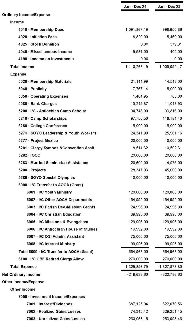 This report offers a detailed account of our financial activities over the past year. We encourage you to prayerfully review it, knowing that "the plans of the diligent lead surely to abundance" (Proverbs 21:5) Your engagement and feedback are welcomed, as we are committed to complete transparency and accountability – principles we hold dear in our financial stewardship It is with gratitude that I share that the Archdiocese has received three consecutive unaltered external audit reports, a testament to our commitment to integrity. We anticipate the completion of the 2024 audit by the time of the convention, continuing this tradition of excellence