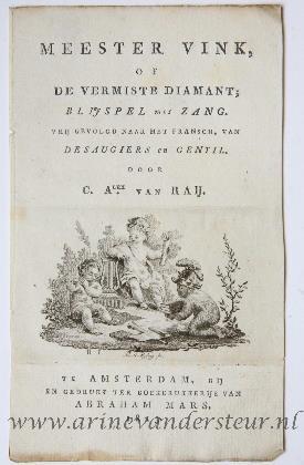 [Antique title page, 1813] Meester Vink of de Vermiste diamant; blijspel met zang, published 1813, 1 p. Title page of Alex van Raij’s “Meester Vink of de Vermiste diamant; blijspel met zang. ” featuring a vignette by H. L. Mijling, as signed at bottom The vignette depicts three naked putti, one playing a transverse flute, the one in the middle is holding a lyre and the third on the right is holding a bunch of books in his hands, while wearing a feathered helmet. From the first edition of the libretto.