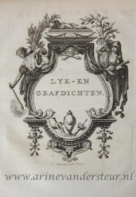 [Antique title page, 1784] Monument for Juliana Cornelia de Lannoy / Gedenkzuil voor Juliana Cornelia de Lannoy, published 1784, 1 p. Commemorative monument in a forest for the poet Juliana Cornelia de Lannoy (1738-1782). On the monument a crying putto and a grieving woman. Signed at bottom: Bilderdyk inv. et del. / Vinkeles sculp. With the address of the publisher below: Te Leyden by A. en I. Honkoop MDCCLXXXIV Possibly used as frontispiece or book illustration to Nagelaten Dichtwerken, collecting the poems by de Lannoy.