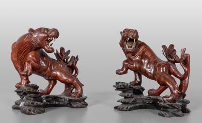 Coppia di pantere in legno scolpito con denti in osso, Arte Orientale sec.XX