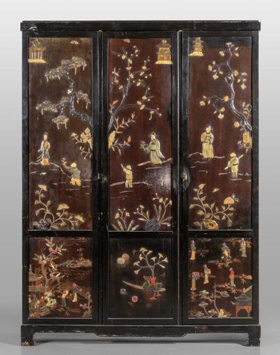 Armadio a tre ante a fondo scuro con intarsi a rilievo in madreperla, stucco e pietre colorate raffiguranti scene di vita orientale, Giappone sec. XX