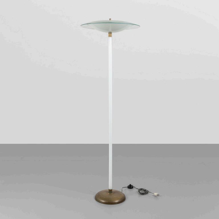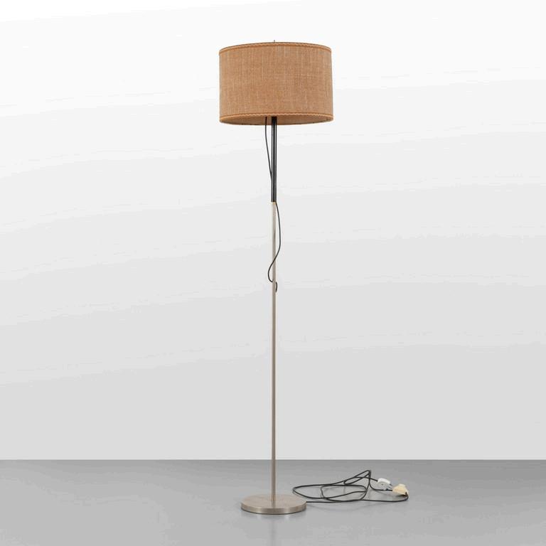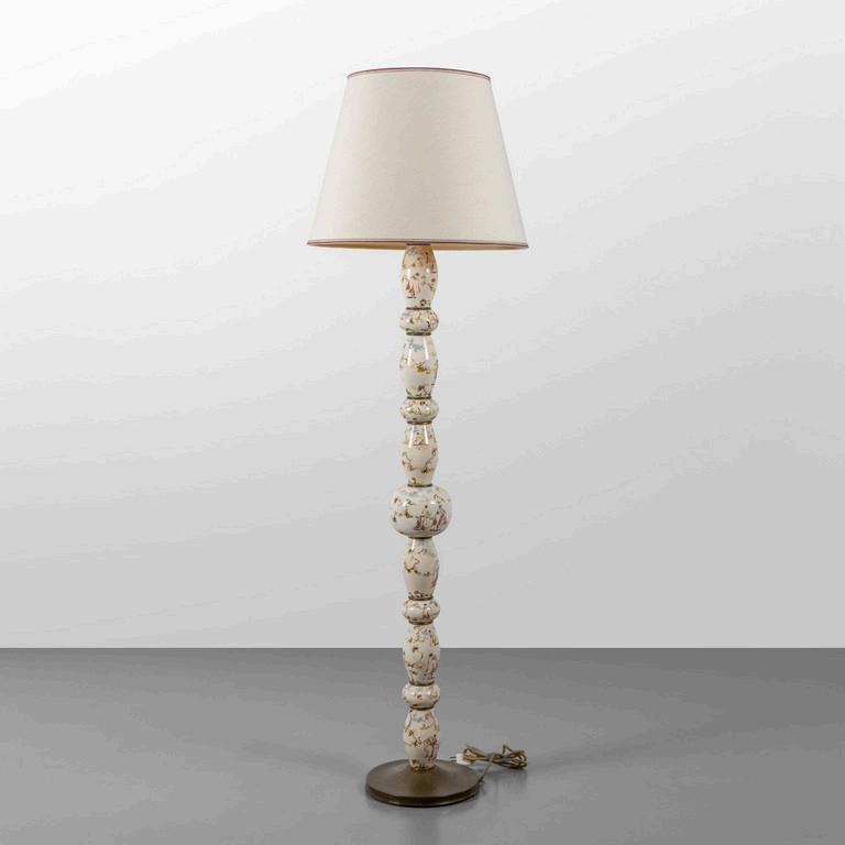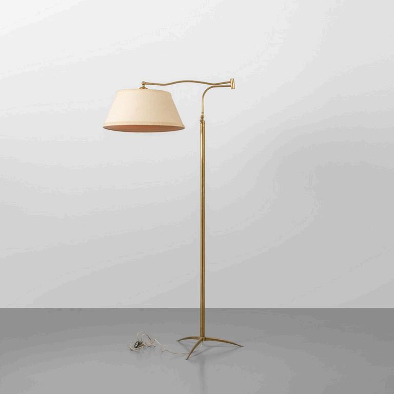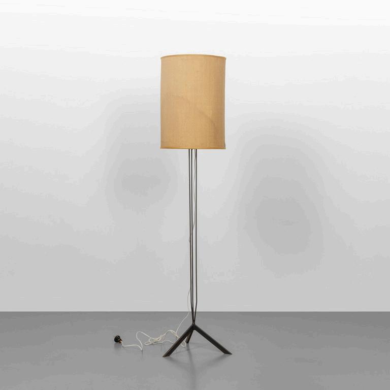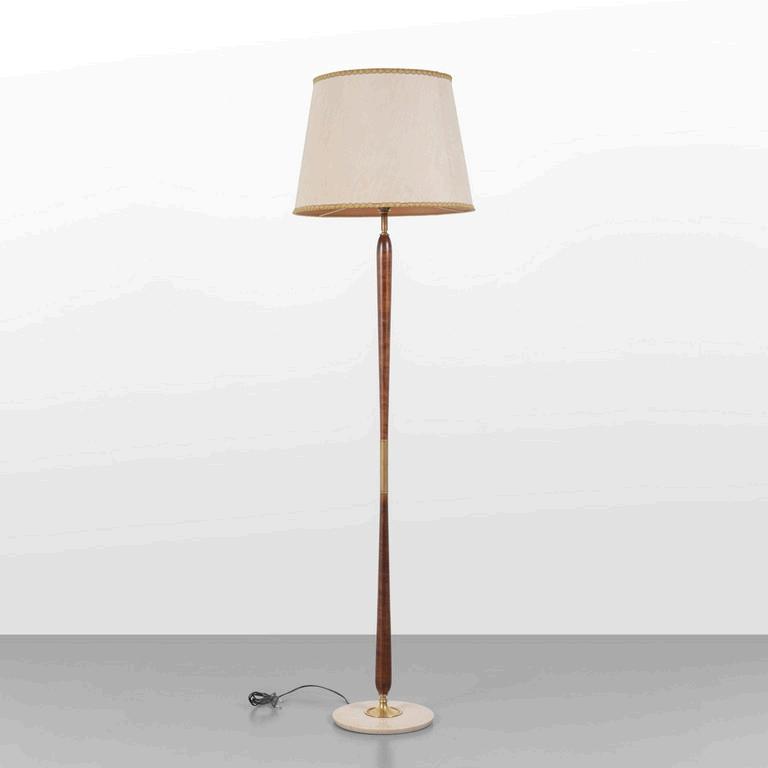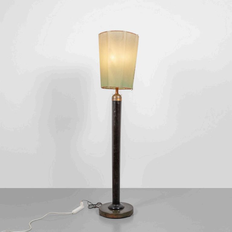 UNA LAMPADA DA TERRA anni '30. Legno laccato legno ebanizzato rame paralume in plastica (alcune rotture). Cm 182 (h).