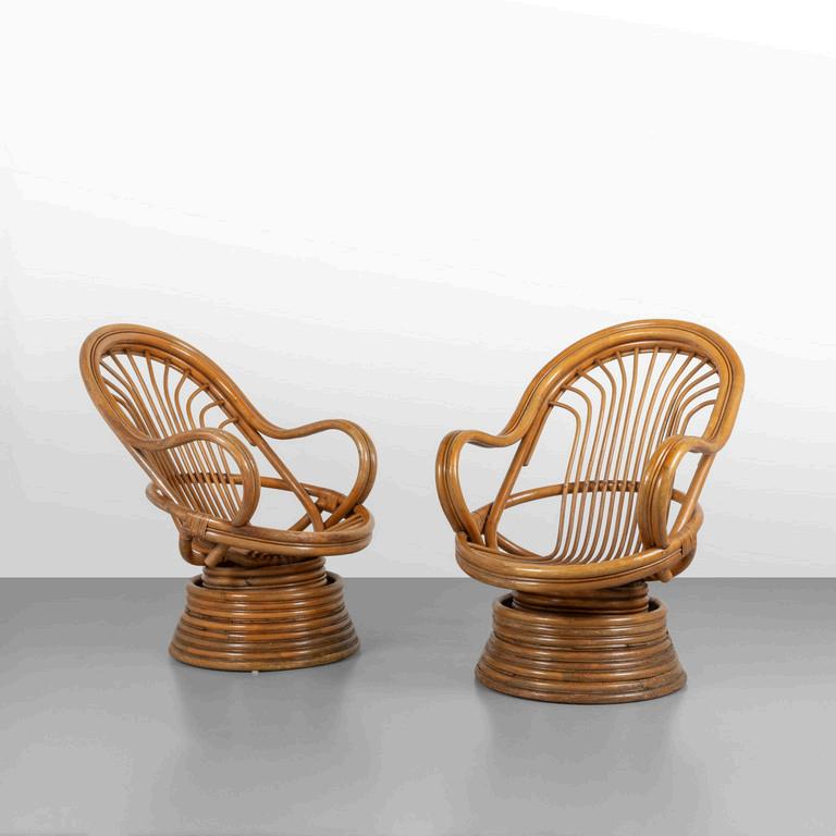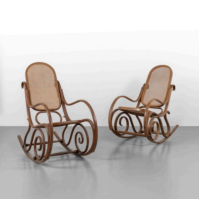 DUE POLTRONE A DONDOLO anni '20. Legno di faggio canna d'India. Cm 105 (h) x 55 (l) x 98 (p).