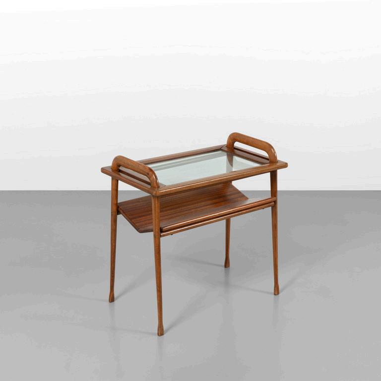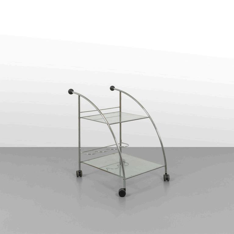 UN CARRELLO anni '30. Legno di rovere in parte ebanizzato vetro opale nero ruote. Cm 69 (h) x 90 (l) x 46 (p).