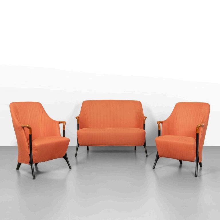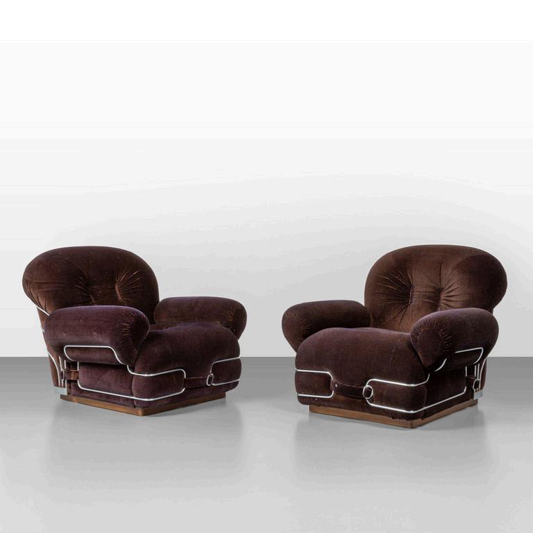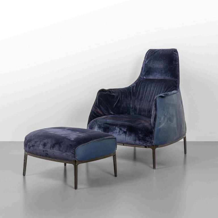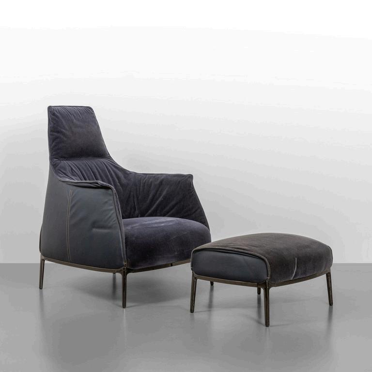 JEAN MARIE MASSAUD POLTRONA FRAU 2009. Una poltrona 'Archibald A' ed un poggiapiedi. Strutture in acciaio imbottiture rivestite in pelle e velluto. Etichetta della Manifattura. Cm 107 (h) x 80 (l) x 85 (p).