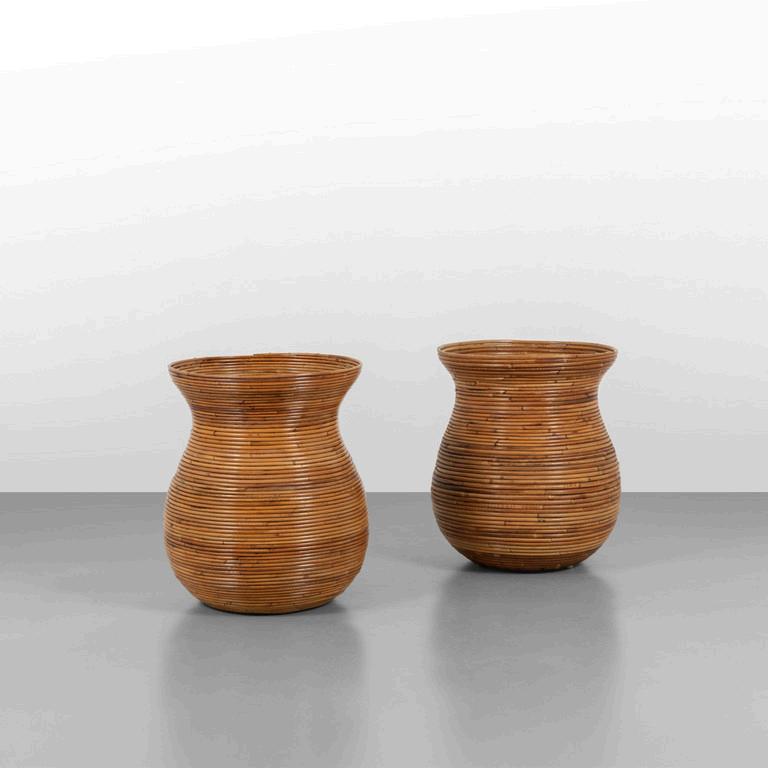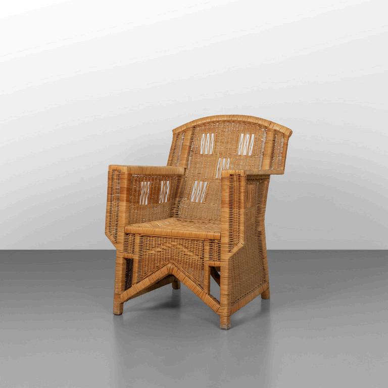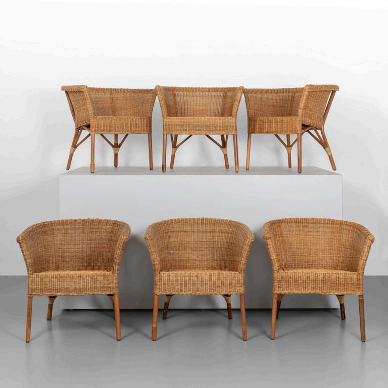 PIERO LISSONI BONACINA 2011. Sei poltroncine 'Cassis'. Strutture in giunco sedili-schienali in midollino. Etichette della Manifatture su due poltroncine. Cm 70 (h) x 69 (l) x 62 (p).