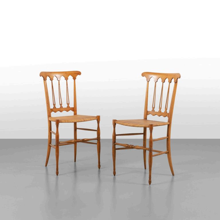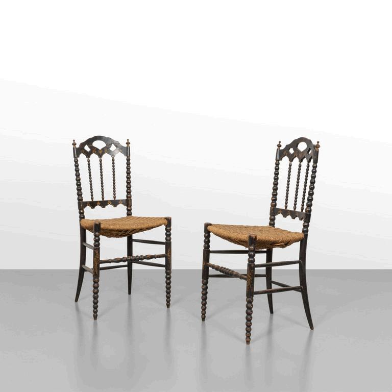 DUE SEDIE anni '20. Legno ebanizzato con decori floreali corda intrecciata. Difetti: restauro (incollaggio) sul terminale di uno schienale rotture di corda. Cm 87 (h) x 42 (l) x 44 (p).