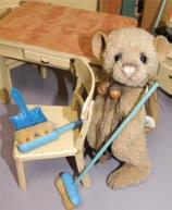1940 – 50’s German Wooden Kitchen Furniture, scaled for a 7 – 10” dolls – Cabinet 12x10x4, work counter 8x5x4.5, lower cabinet (door off hinge) 5.25x3.5x2.5, stove 4x4.5x3, broom closet 9x3.5x2.5, table 7x4x5, 2 chairs 5x3x3 & towel rack 5.5x2 $265. 7” Artist made jointed alpaca mouse by Tender Heart Teddies – Cathy Knapp $99.95