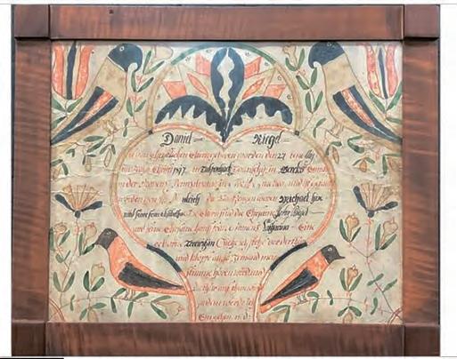 Shearer paintings, French and German dolls, Halloween papier-mâché lanterns, die-cut decorations, cookie cutters, redware, and fraktur rounded out the items. Prices reported include an 18 percent buyer’s premium. A Conrad Trevits hand-drawn taufshein fraktur, framed, brought $1,298. Ziegler bought it for $1,900 on May 21, 2016, at an on-site sale in Robesonia held for the Breininger family. Conducted by John Hess’s Conestoga Auction Co., there were nine such on-site sales at the residence forever referred to as Taylor Mansion. The late Lester Breininger paid $1,755 for the fraktur on Oct.