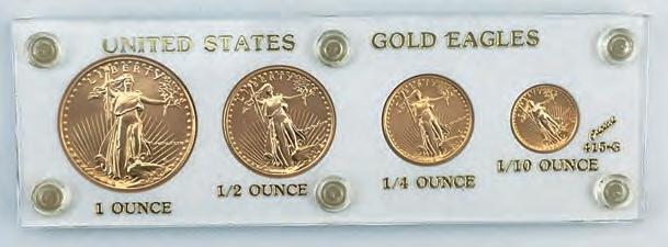gold coin. They are 22-karat gold bullion (92 percent with 8 percent copper alloy giving it the reddish hue and durability). Finally, a U.S. gold Eagles set went for $9,676. To learn more about this or upcoming sales, visit www. kleinfelters.hibid.com.