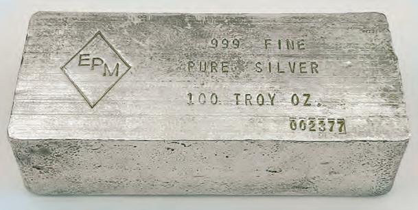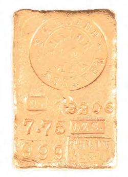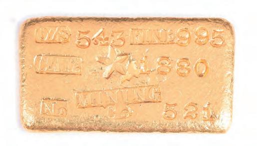 THOUS / FINE.” A small group of these gold ingots was discovered in the late 1960s. In all, only a couple dozen specimens are known today. This one fetched $67,650. A gold bar from the Star Mining Company which operated in Rose Creek, Calif., from 1870 to 1895, serial number 521, graded 995 fine and weighing 5.43 ounces, featured bright yellow-gold surfaces and excellent luster. The name of the mining company was signified by a five-point star above the letters “MINING CO.” These bars are extremely rare, and this example changed hands for $44,280.