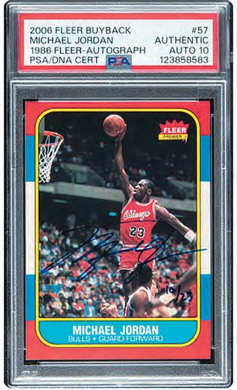 A 2006 Fleer Buyback Michael Jordan (1986 Fleer-Autograph) #57 PSA Authentic, Auto 10, realized $884,500. It is one of just 23 examples signed by Jordan in 2006, marking the 20th anniversary.