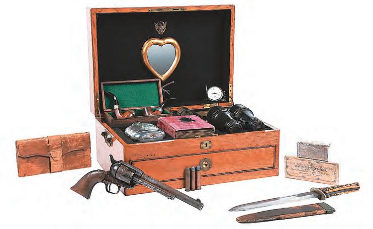 A U.S. Cavalry model Colt Single Action Army revolver with officer’s field desk ensemble, serial #4812 and Ainsworth-inspected, of the type issued to Custer’s 7th Cavalry prior to the 1876 Battle of Little Bighorn, hit the mark for $39,360. The firearm was part of a militaria grouping housed in an attractive replica quarter-sawn oak campaign desk with the inside of the lid mounted with a heart-shape mirror. Inside were period accessories like those Custer’s officers might have used, including period clothing, a Bowie knife, and ammunition. A ca. 1880s .45 cartridge