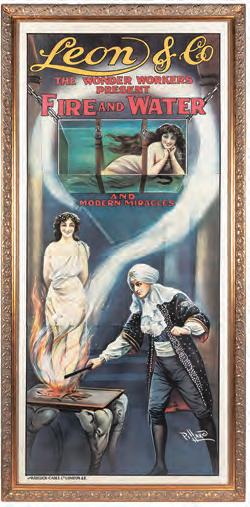 The top lot in this sale was a poster titled “Leon & Co., the Wonder Workers Present Fire and Water.” Estimated at $10,000 to $20,000, it delivered $28,800. This framed, linen backed poster measured 87-by39 inches and was published in London by Haycock-Cadle