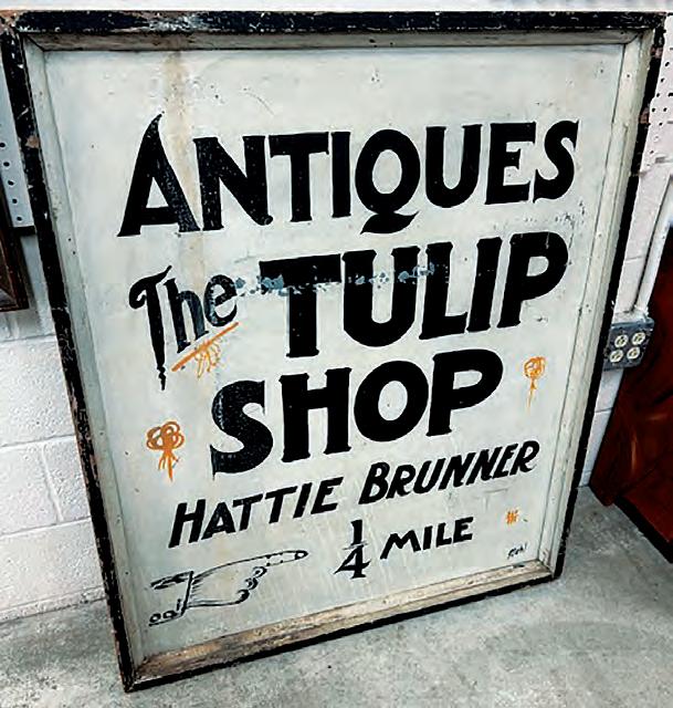 The large double-sided painted tin Hattie Brunner Tulip Shop sign sold for $13,800 to a descendant of Brunner. Pass photo.