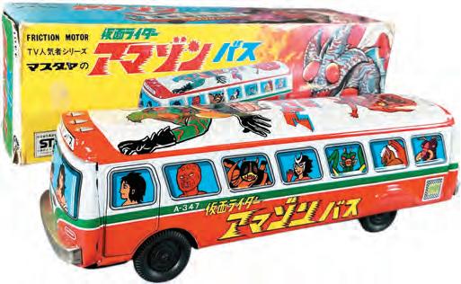 The Masudaya (Japan) Kamen Rider bus, lithographed tin, friction powered, with hero imagery along the sides, pristine condition, in working order, and accompanied by its original box, will be estimated at $1,500 to $2,500.