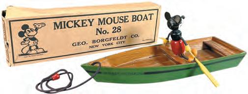The George Borgfeldt Co., Mickey Mouse Fun-E-Flex (USA) Boat No. 28 with seldom-encountered original box in crisp condition, very colorful and early licensed piece with strong character graphics, will be estimated at $2,500 to $5,000.