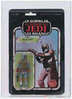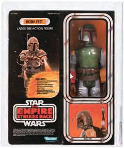 introduced, the oversize series didn’t catch on with “Star Wars” fans, who preferred the smaller figures. Production of the 12-inch Series was scaled back, ultimately making figures like the Boba Fett quite scarce, especially in such highgrade condition. Housed in its window box, the toy was AFA-graded 85 NM+, one of only four examples in that grade with none higher, according to the current AFA Population Report. Against an estimate of $5,000 to $10,000, the foot-tall Boba sold for world-record price