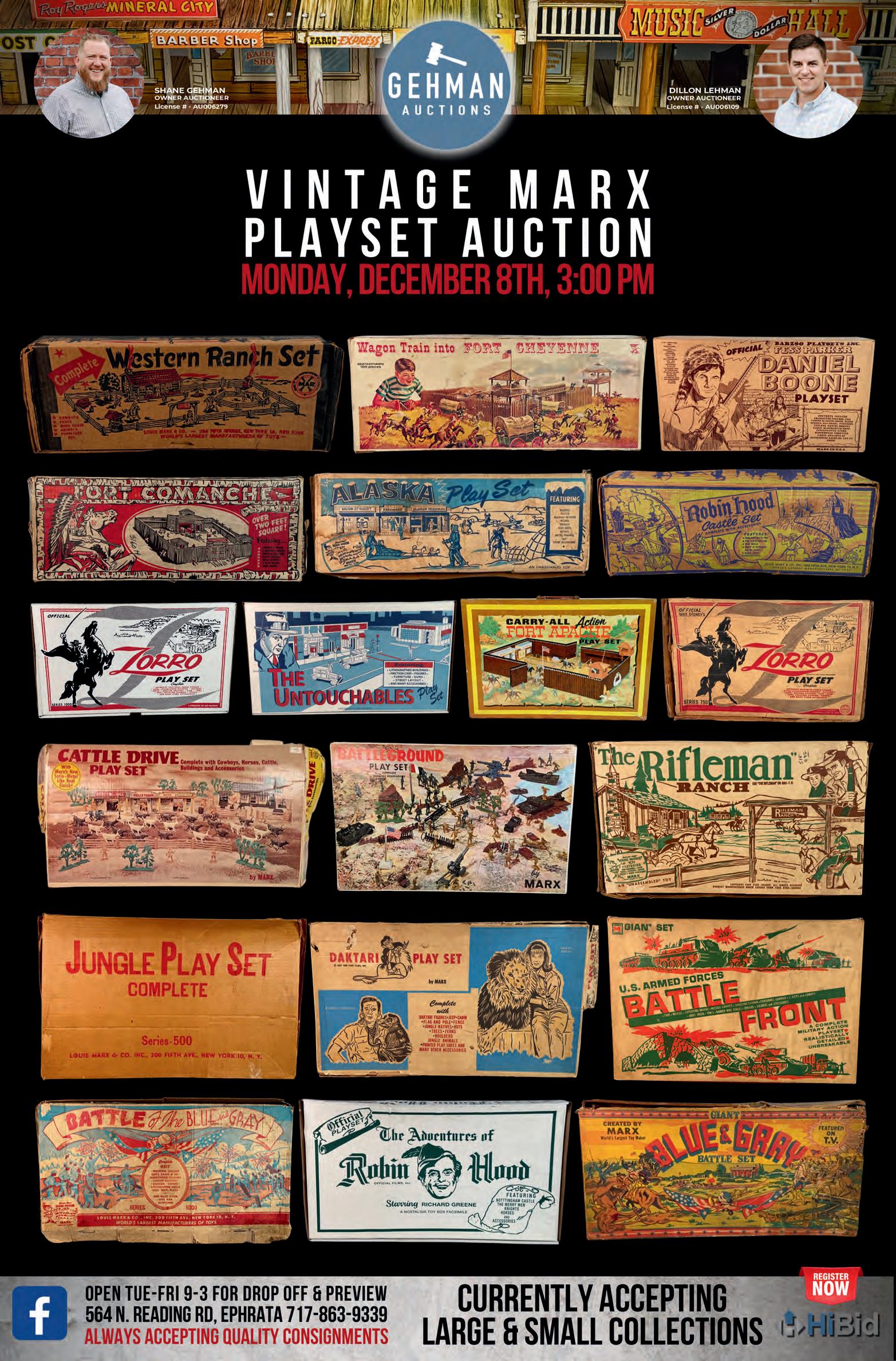 12/08/2025, Ephrata - Mon 3 PM & Online, gehman auctions.hibid.com. Vintage Marx playset auction. Gehman Auctions
