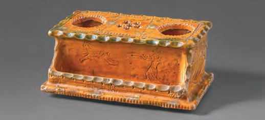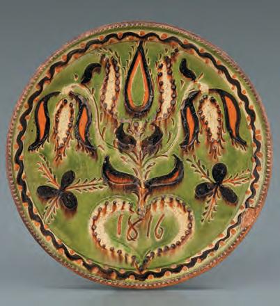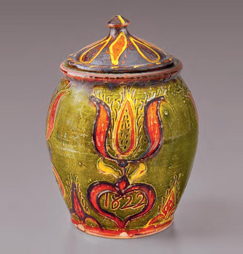 three generations of potters active on Haycock Mountain in Bucks County and a second groundbreaking essay that reattributes a striking group of redware from Solomon Grim to a potter active in central Pennsylvania. Thanks to the discovery of a dark-glazed jar signed “Schwartz” for black or dark on the bottom, Malone realized that all the allegedly signed plates were in fact inscribed “Grin” or green in Pennsylvania High German rather than Grim. Many examples also have histories in central Pennsylvania rather than Berks County. Jeff Pressman investigates political iconography on redware by Samuel Troxel (18031870), and Lisa Minardi, in her second essay, surveys the massive output of Jacob Medinger, typically considered the “last” of the traditional Pennsylvania German potters. Yet other authors reveal that Pennsylvania German redware of the 20th century extended well beyond Jacob Medinger. Adam Zayas, former head ceramicist at the Moravian Tile Works, highlights the role of Henry Chapman Mercer (1856-1930) in reinventing redware for a modern aesthetic. Karl Pass examines the overlooked life and works of Mildred Weekes Keyser (1892-1950). Other