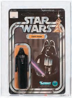grade, with none graded higher. It concluded its bidding run at the upper end of its estimate range at $16,875. Ordinarily a dark character, Darth Vader stepped out of his iconic role as a villain long enough to take a bow in the auction spotlight in the form of a “Star Wars” (1978) 12 Back-C AFA 85 NM+ action figure. Measuring 4.25 inches tall on an unpunched blister card, this toy had condition going for it, since a mere three examples have ever been graded