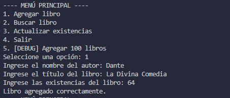 En esta captura elegimos la terca opción Actualizar libro, donde podemos actualizar las existencias del libro que ingresemos. Luego al buscar el libro, veremos las nuevas existencias.