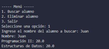 En la siguiente captura podemos ver el menú principal del programa, donde si elegimos Buscar alumno colocamos su nombre y saldrán los datos del alumno registrado.
