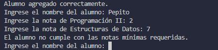 Siguiendo con el ejercicio de la página anterior, podemos observar que ingresamos un nuevo alumno, el cual esta vez no cumple con las notas requeridas.