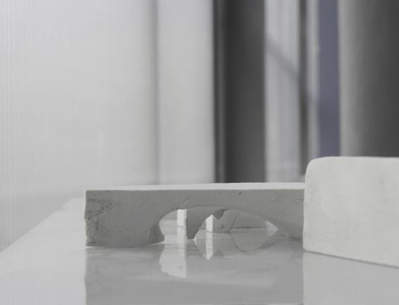 26 Dispositif de percée publique Maquette d’étude, plâtre, (370 x 125 x 130 mm). Maquette de matérialité, béton, (950 x 402 x 250 mm).