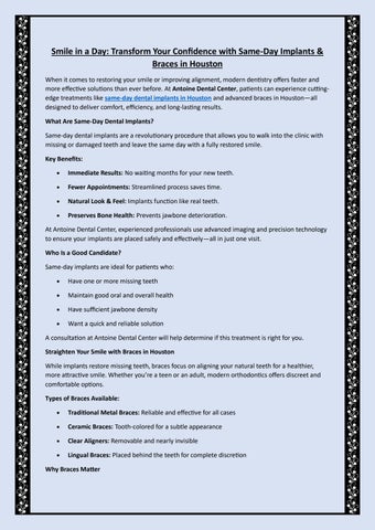 When it comes to restoring your smile or improving alignment, modern dentistry offers faster and more effective solutions than ever before. At Antoine Dental Center, patients can experience cuttingedge treatments like same-day dental implants in Houston and advanced braces in Houston all designed to deliver comfort, efficiency, and long-lasting results.
