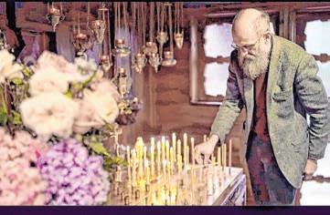 Igor Tchiberev lighting candles inside the Church of Our Lady of Kazan in Sea Cliff at an evening service.